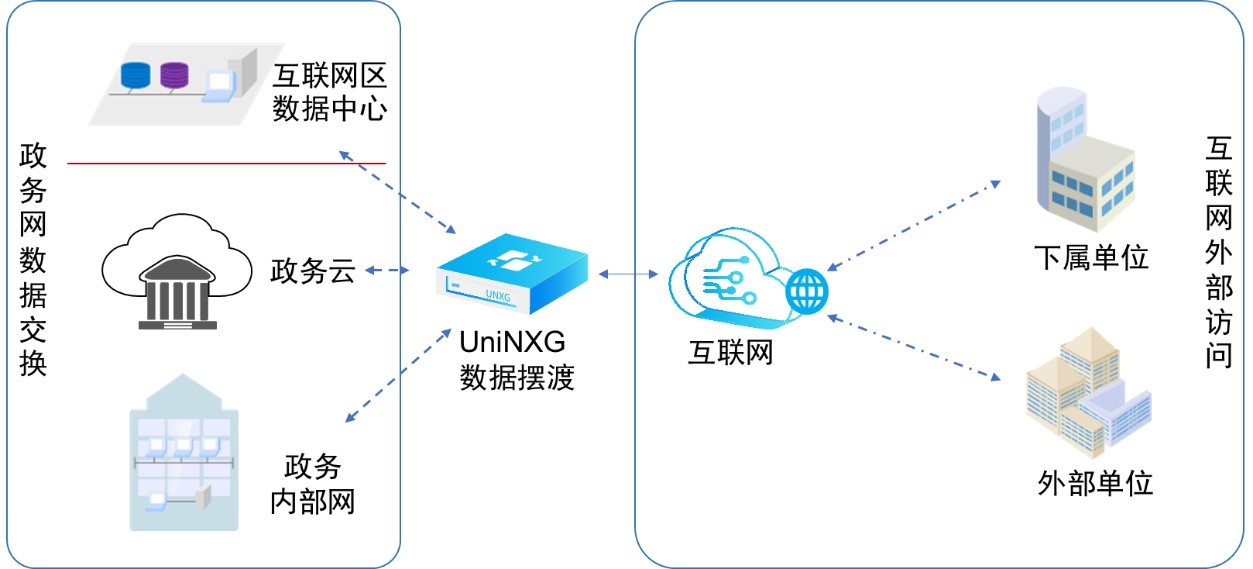 业务交换:在业务大厅内部署UniNXG系统,业务需求者办理业务时通过外部的终端使用UniNXG往内部导入文件,政务人员通过UniNXG导出文件给业务需求者,如税务。