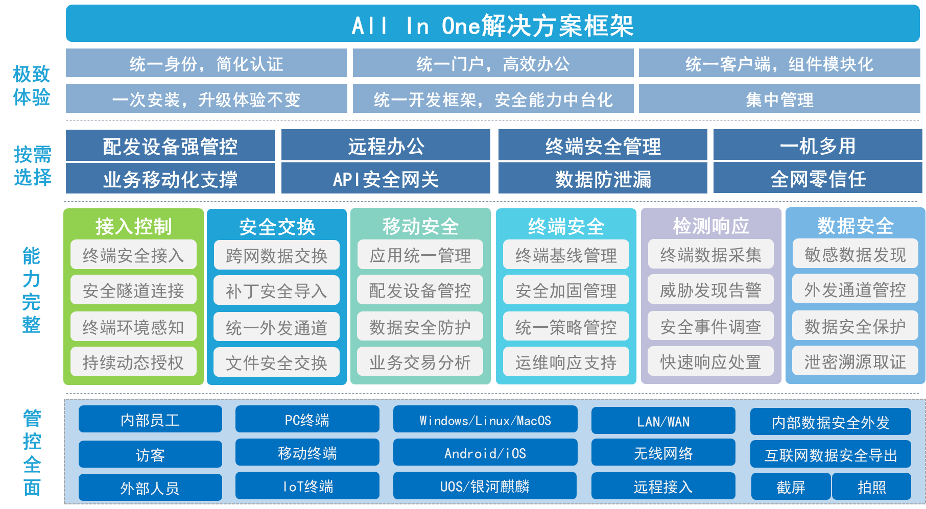联软科技全网零信任解决方案融合了SDP软件定义边界、NAC准入安全、NXG数据安全交换、EMM移动安全、EPP端点安全、EDR终端检测与响应、DLP数据安全等功能,通过一套平台、一个客户端集成了接入安全、端点安全、数据安全的能力,全面针对不同身份、不同设备类型、不同操作系统、不同接入场景、不同的数据外发方式进行管控。