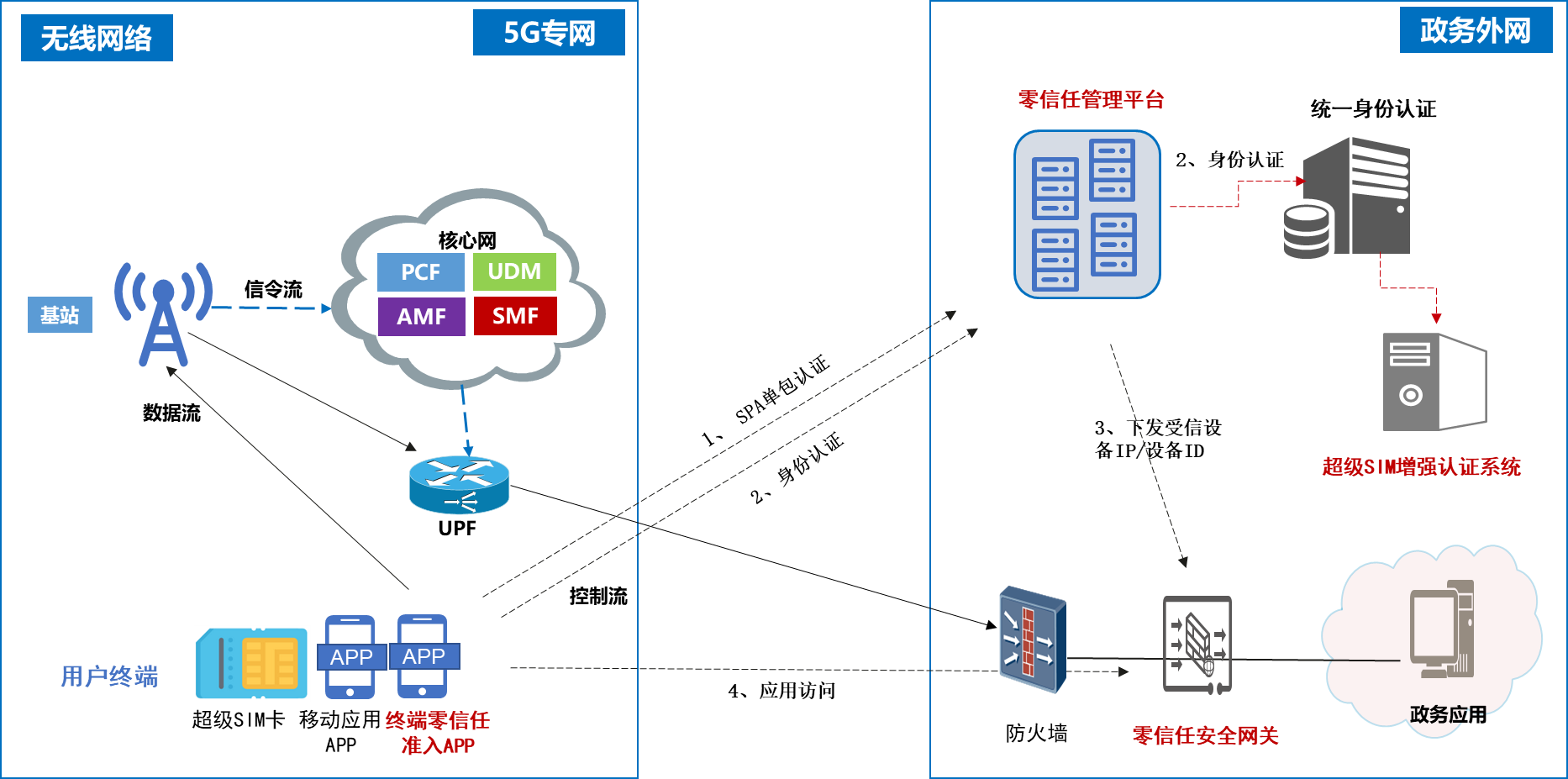 国家电子政务外网作为我国电子政务重要公共基础设施,是服务于各级党委、人大、政府、政协、法院和检察院等政务部门,满足其经济调节、市场监管、社会管理和公共服务等方面需要的政务公用网络。5G技术具有高带宽、低时延、海量终端通信三大基本特征,正赋能促进政务信息化、数字化、智能化转型。5G基础设施布局、以5G专网为代表的创新技术发展基本成熟,足以支撑政务行业赋能,各地政府单位已开展5G智慧应用建设,如移动办公、移动执法、疫情防控、安防监控等场景,5G新技术的政务应用处于快速发展阶段。 在政策推动方面,《“十四五”国家信息化规划》代表着由中央从顶层规划5G发展数字蓝图。国家大力支持出台包括《5G应用“扬帆”行动计划(2021-2023年)》在内的政策文件,其中各省市重点扶持5G政策文件574个,全国各地掀起了5G应用“扬帆”发展的热潮,各地政府纷纷结合当地实际需求和产业特色推出5G发展行动计划。同时,也对5G专网提出了很高的安全要求,例如十四五“国家信息化规划”中提出要强化5G网络安全保障体系;《广东省电子政务外网5G无线接入服务建设规范》中要求:5G无线网络应提供网络侧的二次认证能力,并应对接政务外网认证服务器,当5G无线网络核心网收到移动终端的业务请求时,触发用户二次鉴权。国家信息中心也于2022年7月1日颁布《政务外网终端一机两用安全管控技术指南》,5G专网作为政务外网组成的一部分也应该参考该标准要求,利用零信任技术,确保只有合法合规的终端才能接入到5G专网访问相应权限范围内的应用。 5G专网带来高速、便捷的政务业务访问,同时也伴随着安全风险,这些风险来源于:(1)5G专网二次认证安全风险:终端接入到5G网络时通过5G核心网UDM进行的鉴权认证成功后,获得5G专网网络资源,在访问电子政务网时不需要进行认证,存在安全风险。(2)5G专网热点共享安全风险:终端接入到5G专网存在热点共享非授权访问风险,即5G专网手机开启WIFI热点,非授权终端能够通过该热点访问5G专网。